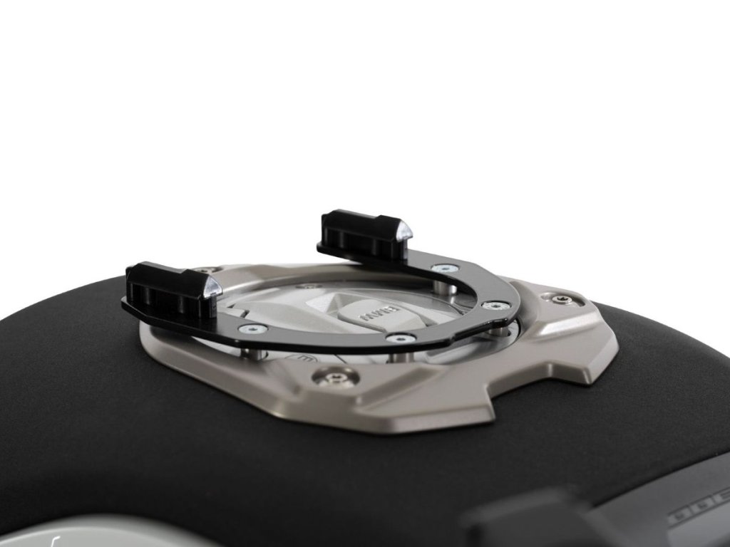 Držák tankvaku s mechanickým uzamčením Hepco Becker Tankring BASIC, specifický pro motocykl, umožňuje připevnění tankvaku na motocykl. Tankvak se jednoduše nasadí a slyšitelně uzamkne na prstenci nádrže díky sofistikovanému mechanismu. Součástí dodávky je také úchyt na tankvak, který lze individuálně přišroubovat k tankvaku v závislosti na tvaru nádrže a úhlu řízení. Víčko nádrže lze bez problémů otevřít i s nasazeným kroužkem nádrže. Při odjištění se mechanismus odblokuje upínacím popruhem ve směru jízdy v přední části tankvaku, který se pak jednoduše vyjme.