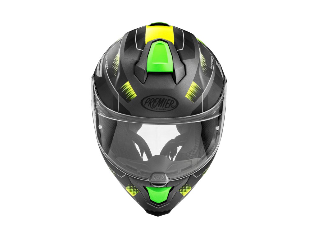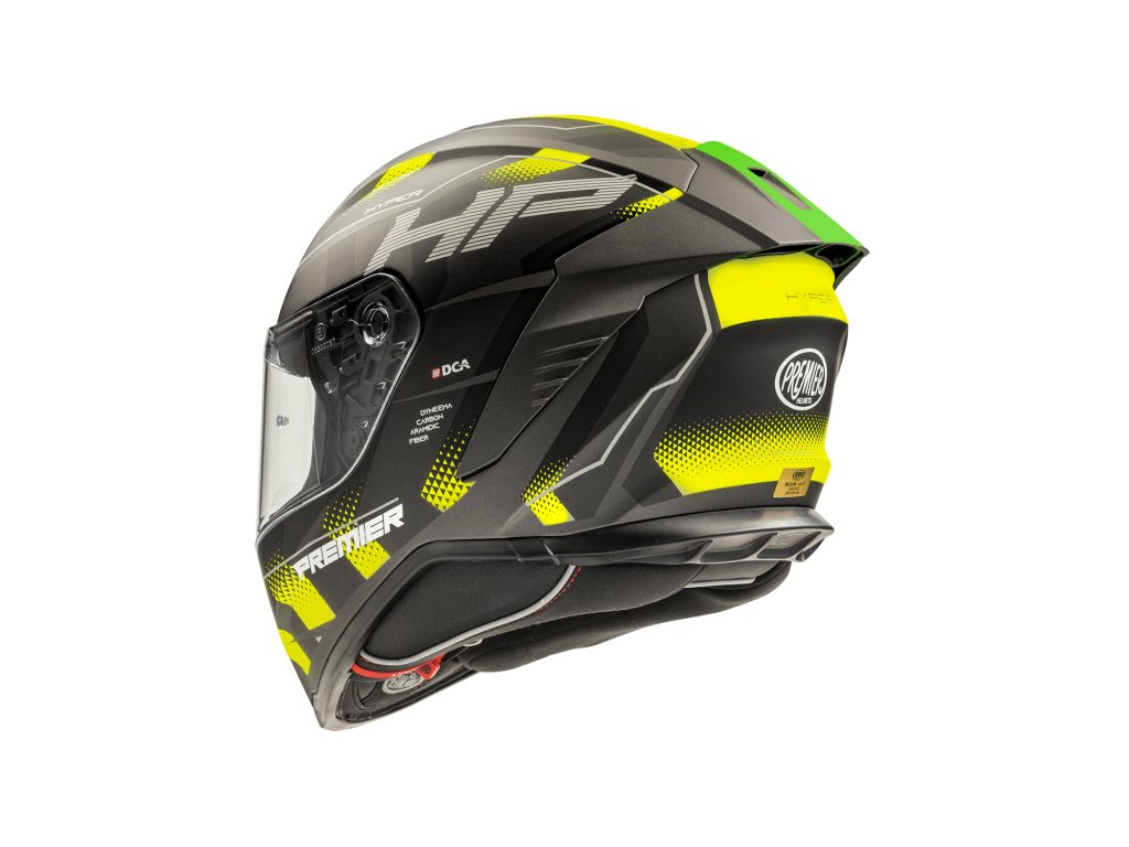 - Integrální helma PREMIER z kolekce HYPER má konstrukci skořepiny z trikompozitního vlákna, směsi aramidového vlákna a epoxidové pryskyřice, díky čemuž je přilba elastická, ale odolná v případě nárazu
