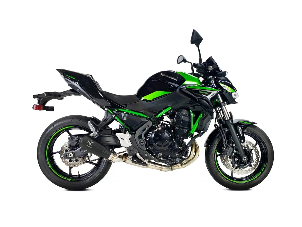 Kombinace matně černého těla výfuku a karbonových detailů dodává naháči Z650 i kapotované Ninje 650 agresivní vzhled inspirovaný speciály z Moto GP.