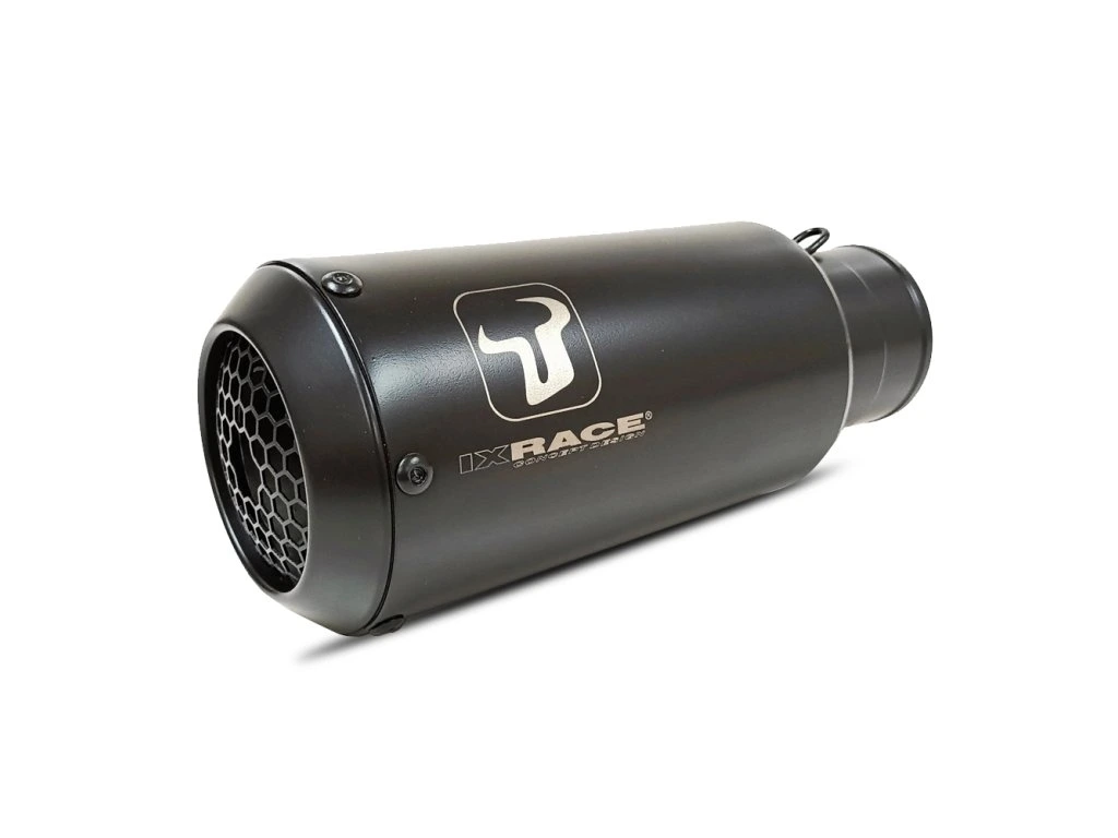 Moto GP styl: Kompaktní koncovka s ochrannou mřížkou AFS (Anti-flame System) a laserem vypáleným logem IXRACE.