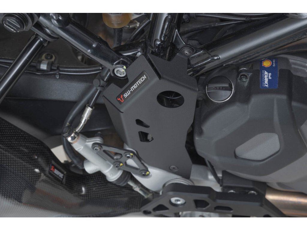Chránič paty vyroben z hliníku zabraňuje kontaktu s horkým výfukem a chrání i před pohyby řetězu nebo kyvného ramene.