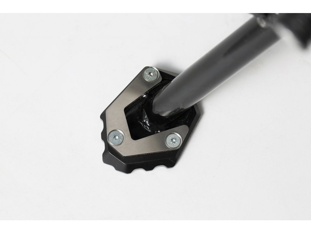 Rozšíření bočního stojánku na moto SW Motech má velkou kontaktní plochu pro lepší stabilitu i na nerovném terénu a měkké půdě. Při vývoji nových produktů je prioritou SW Motech přesné uchycení a snadné použití při každodenním ježdění. Profilovaná horní část rozšíření stojánku usnadňuje rozložení stojanu i u těžkých bot.